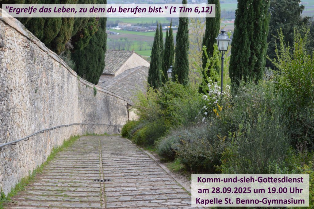 Deshalb findet während der Schulzeit in der Kapelle des St. Benno-Gymnasiums einmal im Monat ein Komm-und-sieh-Gottesdienst statt. Er ist ähnlich wie die Abendgottesdienste der Brüder in San Damiano gestaltet. An dem Wortgottesdienst können alle Interessierten teilnehmen: SchülerInnen, Freunde, Ehemalige, Eltern und Lehrer sind eingeladen: Komm und sie!“ Er dient der Verlebendigung, Vertiefung und Reifung der ursprünglichen Erfahrungen in den Realitäten des persönlichen Lebens. Erst dadurch entfaltet sich deren prägende Kraft in konkreten Wertehaltungen, in Entscheidungen, im Handeln im Kontext des persönlichen, gesellschaftlichen und politischen Lebens.